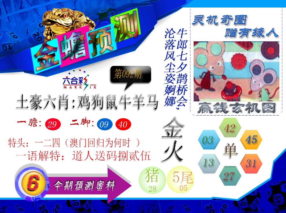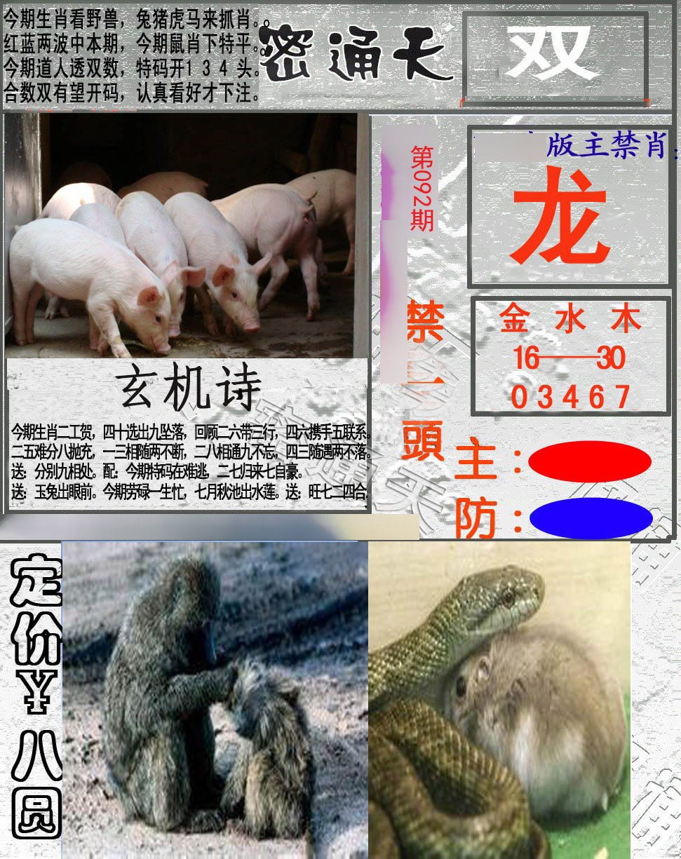 | 092期;【虎兔马狗羊猪鼠蛇鸡】开:?00准 |